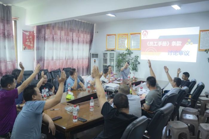 會議環(huán)節(jié),安環(huán)委主任通篇朗讀新版《員工手冊》安全管理條款,公司各部門中層及以上管理人員共同討論審議,舉手表決,全票通過。新版《員工手冊》將于2023年7月在朝陽集團正式啟用執(zhí)行。